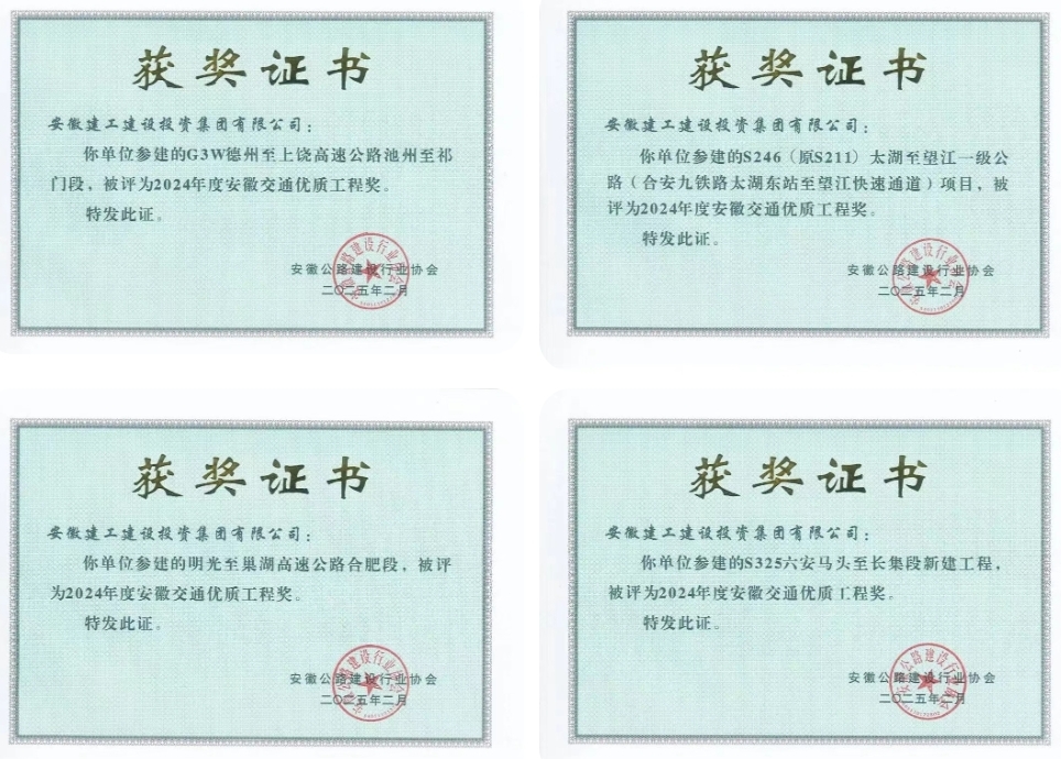 安徽交通优质工程奖由省交通运输厅主办,评选过程严格,旨在表彰在公路、水运等交通基础设施建设领域内设计优秀、管理科学、技术先进、质量优良、运行安全且效益显著的工程项目,是安徽省交通建设行业重要质量奖项之一。建工建投公司此次获奖项目包括G3W德州至上饶高速公路池州至祁门段、S246(原S211)太湖至望江一级公路(合安九铁路太湖东站至望江快速通道)项目、明光至巢湖高速公路合肥段、S325六安马头至长集段新建工程,充分展现了企业在交通建设领域的技术实力和质量管理水平。
