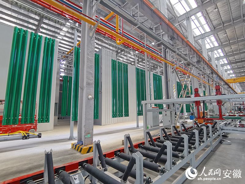 以波形梁护栏为例,该产品生产制作并不复杂,但由于皖北皖中皖南气候条件不同,对产品防腐工艺要求极高。在产业园一期,已经配备全自动公路波形护栏板冷弯成型生产线、热镀锌生产线及喷粉复合生产线,其中全自动喷粉复合生产线采用积放链输送工艺,集成国内外先进设计理念,实现环氧锌基与热镀锌喷塑双防腐工艺兼容,工件从下件到覆膜包装全程自动化,智能化水平位居全国前列。