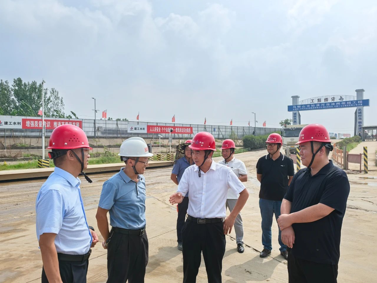 8月5日,建工水利公司党委副书记、总经理杜海峰会见马鞍山市水利局副局长汪学伟,并对在建项目进行调研指导。