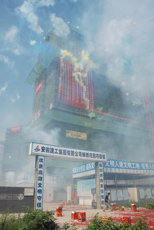 2012年7月26日上午,阳光明媚,礼炮齐鸣,安徽九华房地产开发有限公司开发建设的锦绣花园项目11号、12号、13号住宅楼工程结构顺利封顶。九华公司董事长、总经理杨斌,副总经理吴良照,党总支副书记杨建强及公司各部门负责人出席了庆典仪式,施工和监理单位相关人员一同参加了庆典仪式。