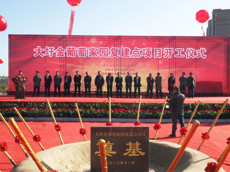 “彩旗飘扬迎党代会胜利召开,欢歌漫舞展包河新时代雄风” 2012-11-11上午9时,安徽水利承建的大圩金葡萄家园项目举行开工典礼,合肥市副市长周善武,市政府副秘书长杨伟、市政府副秘书长、建委主任常先米等领导出席了开工仪式。