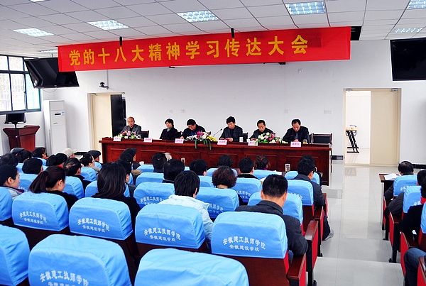 11月30日,安徽建工技师学院在新教学楼录播室召开了学习贯彻党的十八大精神大会。安徽建工集团副总经理、学院院长王礼义和学院领导出席大会。部分离退休老同志应邀出席,全体在职的党员参加了大会。纪委书记、工会主席龚维加主持大会。