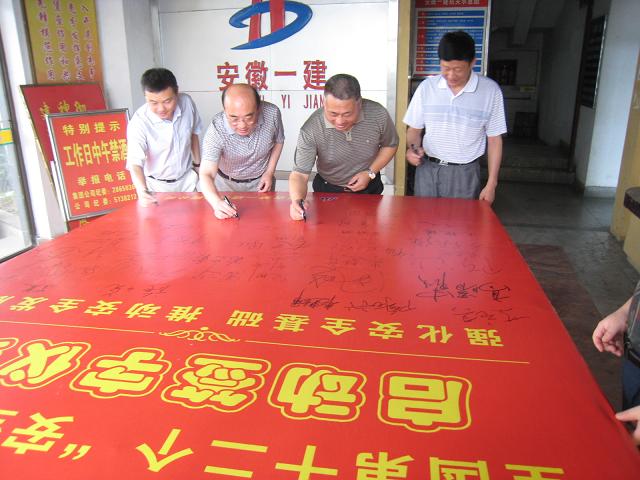 为全面贯彻落实党中央、国务院和各级政府关于安全生产工作的一系列方针政策,深入开展全国第十二个“安全生产月”活动,根据省住建厅《全省住房和城乡建设系统“安全生产月”活动方案》,安徽一建公司开展安全月系列活动。并于6月6日上午启动了以“强化安全基础,推动安全发展”为主题的安全月签字启动仪式。图为该公司领导班子成员在启动仪式上签字。
