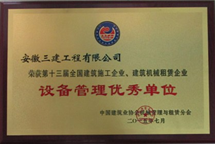 从8月14日在江苏无锡召开的“中国建筑业协会机械管理和租赁分会第七届会员代表大会暨2015年年会”上获悉,安徽三建工程有限公司荣获“第十三届全国设备管理优秀单位”称号。这也是该公司连续第四次荣获该项殊荣。安徽三建所属设备租赁公司副经理朱玉于会上获得“全国建筑施工企业、建筑机械租赁企业设备管理优秀经理”表彰。