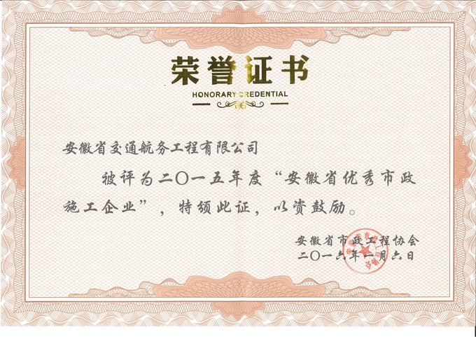 日前,在安徽省市政工程协会发布的2015年度40家安徽省优秀市政施工企业和66位市政优秀项目经理名单中,安徽省交通航务工程有限公司榜上有名,安徽交航方申柱同志同时被评为2015年度安徽省市政施工企业优秀项目经理。