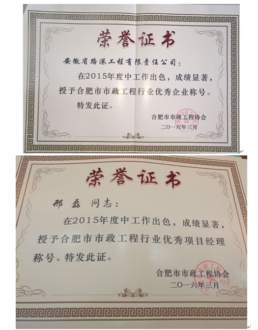 年度“合肥市市政工程行业优秀项目经理”称号。