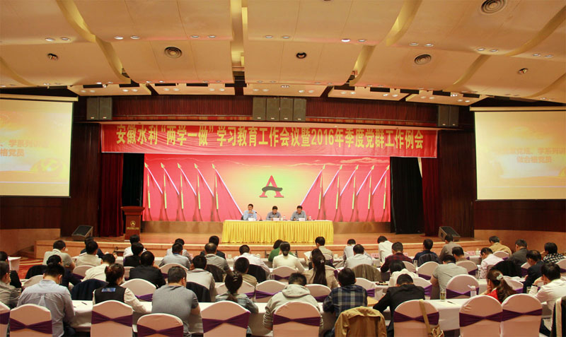 2016年5月10日下午,安徽水利召开了“两学一做”学习教育工作会议暨2016年季度党群工作例会,传达集团公司“两学一做”学习教育工作会议精神,动员和部署公司“两学一做”学习教育工作,安排下一季度党群工作。公司领导,所属各单位党总支(支部)书记、工会主席、团支部书记,工会、纪检监察室、党委工作部和团委全体人员,“五四”受表彰人员参加了会议。