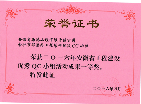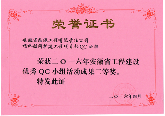 日前,安徽路港公司合肥市郎溪路工程第四标段QC小组开展了《桩基声测管施工质量控制 》课题攻关,杨桥船闸扩建工程项目部QC小组开展了《闸室墙身砼大面平整度质量控制》课题攻关,分别荣获安徽省工程建设优秀QC小组活动成果一等奖和二等奖。
