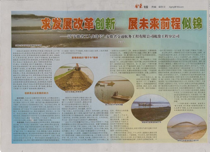 5月20日,安徽工人日报第2版“风采”专版大幅刊登了题为《求发展改革创新,展未来前程似锦》——荣获 “安徽省工人先锋号”的安徽交航疏浚工程分公司先进事迹。