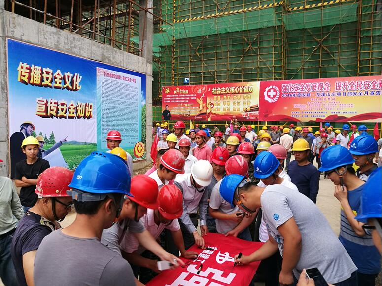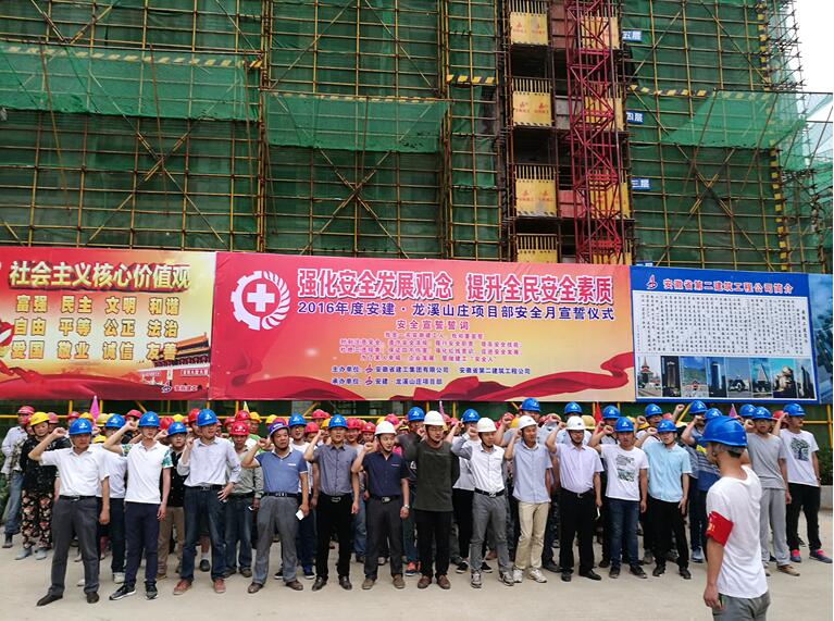 “我是一名安徽建工人,我郑重宣誓:时刻注意安全,遵守安全法规。履行安全职责,提高安全技能。杜绝三违现象,保证四不伤害。强化红线意识,促进安全发展……”。嘹亮的宣誓声响彻整个施工现场,震撼人心。6月1日早晨7:00,在宿松安建·龙溪山庄工程施工现场,由业主、监理及安建·龙溪山庄项目部员工近百人组成的宣誓队伍庄严宣誓,并签字承诺,借此拉开“安全生产月”活动序幕。