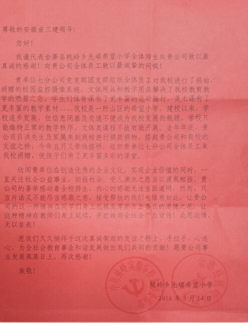 6月13日,安徽三建公司收到金寨县桃岭乡先瑞希望小学发来感谢信,感谢安徽三建七分公司对先瑞希望小学的爱心捐助、无私贡献、大爱无疆。