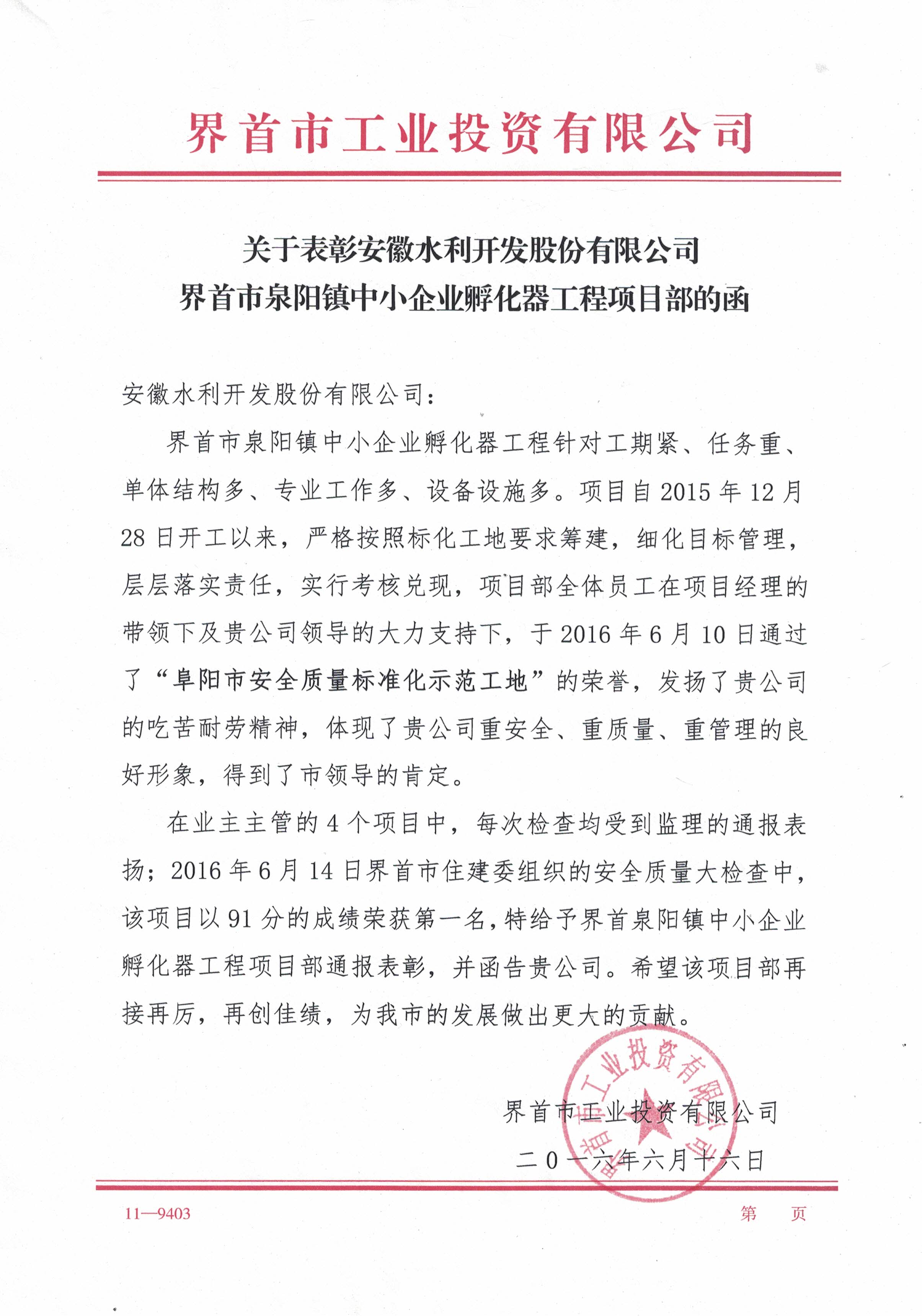 安徽水利界首市泉阳镇中小企业孵化器工程受到业主通报表彰