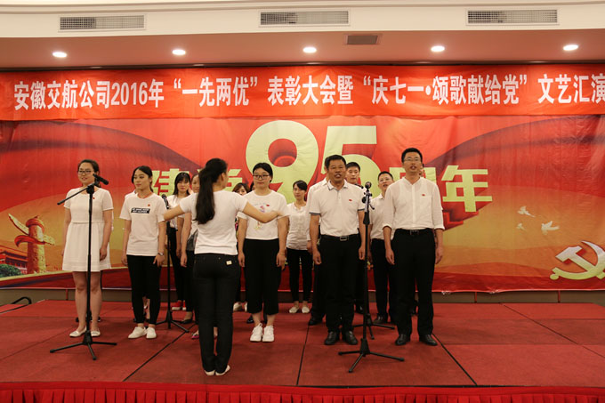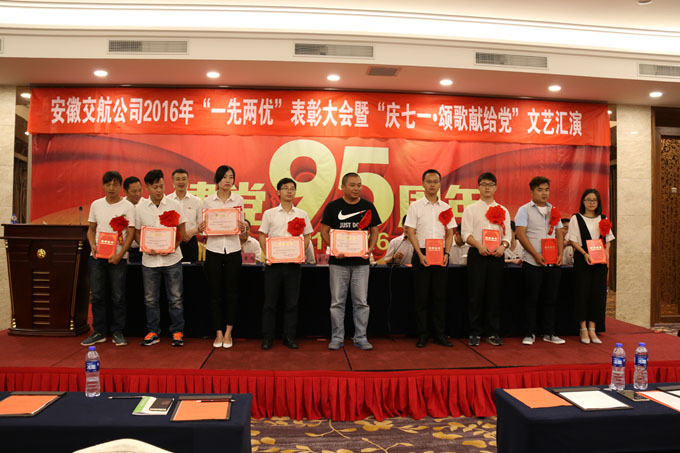 为隆重纪念中国共产党成立95周年,6月22日下午,安徽交航公司顺利召开了2016年“一先两优”表彰大会暨“迎七一•颂歌献给党”文艺汇演。交航公司领导班子成员、机关全体党员、各党(总)支部负责人、获奖党员、入党积极分子共计100余人参加了会议,会议由交航公司纪委书记、工会主席李杨主持。