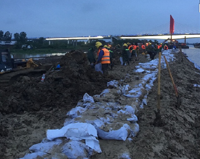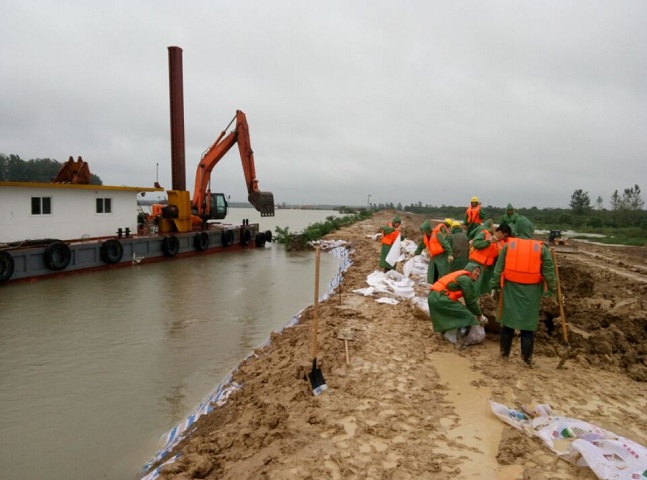 7月3日上午8时,在安徽路港合裕线航道整治项目部,近一周持续的强降雨致使南淝河水位已涨至12.35m,远超历年最高平均水位11.97m,该项目抗滑桩施工段堤顶道路与水位高差仅1m左右。为防止发生意外险情,项目部迅速组织人员、机械成立抗洪防汛抢险突击队,由项目经理带领奔赴抢险第一线。抢险人员面对咆哮着和肆无忌惮的洪水猛兽,毫无畏惧之色,全力置身于抢险现场,大家用袋装土加固岸堤,对防汛大堤进行加高处理。由于险情严峻,该项目部向合裕线07标项目部、铜陵北路高架项目部请求协助,各兄弟项目部积极配合,迅速组织人员奔赴抢险前线。通过一天一夜的抢险工作,该段大堤已全部完成加高加固,稳定了大堤险情,安全状况可控。此次抢险共计投入防汛抢险人员50人、水上挖机1台、泥驳船3艘、挖掘机3台、推土机3台、编织袋5000条、彩条布5000㎡、黏土砂石若干。根据水利部门的紧急通知,南淝河水位还将持续上涨,南淝河大堤险情依然严峻,该项目部将持续监控南淝河水位及已加固大堤情况,及时增加防汛储备物质,安排防汛人员、机械24小时待命,以保证安全度过汛期。