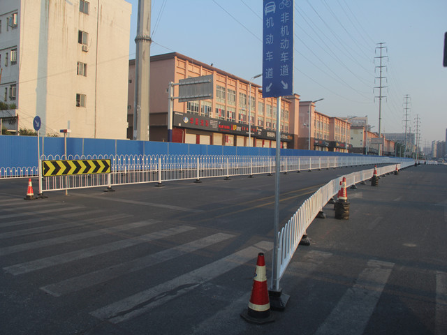 为保证交通畅通,减小对周边居民出行的影响,现场采取半封闭式围挡措施,用护栏进行分道。封道前,项目部领导班子带领项目部全体技术人员及现场施工班组研究制定了交通封闭方案,将工作具体分解到每个人。由于封道期间正值周五晚上,铜陵北路上车流量极大,给项目部工作带来一定难度,项目部本着先交通导改后围挡实施的原则,将整条路段分为8个施工区域,由9个施工班组的200余名工人同步实施,项目部领导班子和全体技术人员共计40余人在现场组织协调、指挥调度,确保了封道和护栏围挡安装工作正常、有序、安全开展。