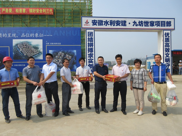 为关心基层员工身心健康,传递企业对员工的关爱,营造良好和谐的工作氛围,近日来,安建地产公司党总支委员分别到各自联系点,开展了向一线员工送清凉、送图书的“双送”活动。这次安建地产到阜阳公司九坊世家项目,慰问全体员工,并为员工送上凉茶、绿豆、毛巾、人丹、风油精等防暑降温物品,并一一慰问员工,了解员工工作和生活状况,为全体员工送去满满的关怀。在为员工送去物资上的清凉外,还为员工带来了精神上的清凉。