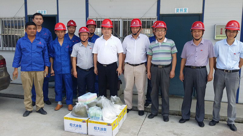 每到一个项目,公司领导都认真听取了项目部施工现场情况详细介绍,了解施工进度和下一步施工计划,仔细询问了现场防暑降温工作的落实情况,对在炎热天气下仍在一线紧张工作的员工表示亲切的问候,要求项目部合理安排好作息时间,避开高温时的作业,并把绿豆、白糖、毛巾、矿泉水、风油精、人丹、十滴水等防暑降温用品亲自送到他们的手中,叮嘱大家一定要做好防暑降温工作,在施工现场多配备防暑降温饮品及药品,采取各种有效措施,确保员工的身体健康和施工安全。