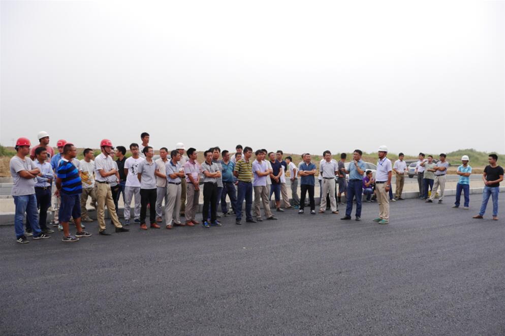 观摩现场,项目经理就兴业大道项目的施工组织,施工进展情况,施工重难点的把控以及文明施工等进行了重点解说;安徽三建公司副总经理李建成从工程的前期准备、协作队伍的选择等方面进行了补充说明。