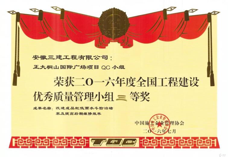 近日,从中国施工企业管理协会传来喜讯,安徽三建安装公司正大桐山国际广场项目QC小组荣获2016年度全国工程建设优秀质量管理小组三等奖,这是安装公司继去年获得全国QC小组奖项的又一重要奖项。