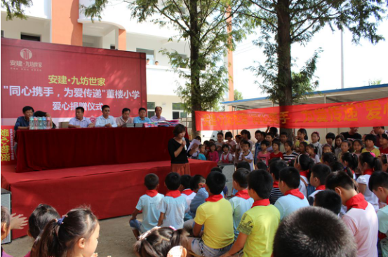 2016年9月9日上午,由安建·九坊世家策划举办的“同心携手,为爱传递”爱心捐赠活动在颍东董楼小学温暖启幕。安建·九坊世家为董楼小学的300多名学生捐赠了书包、文具盒、水杯等物资,并向其中一位家庭贫困、品学兼优的学生颁发5000元梦想助学金。颍东区住建局、颍东区教育局领导,多家媒体及热心公益的爱心人士受邀共同见证了这一温馨时刻。