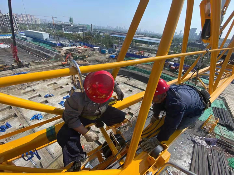 10月1日,设备租赁在合肥一中东校区项目进行塔吊穿绳调试,确保塔吊设备安全运行。