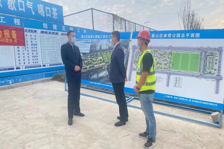 10月21日下午,建工控股党委委员、副总经理盛明宏赴安徽一建公司机关、蜀山区体育公园项目调研疫情防控与安全生产工作,安徽一建党委书记、董事长陆勤斌参加调研。