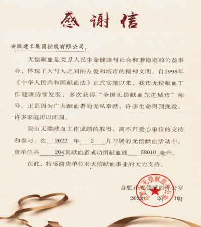 2月10日献血倡议发起,集团各级工会组织积极响应,广泛宣传,短短一天就有近300名职工踊跃报名参加。献血当天分别设立了安建国际大厦献血点和安徽三建献血点,共计204名职工成功献血共计58010毫升,助力了合肥市血站确保北京冬奥会血液调配保障任务的完成,彰显了建工职工无私奉献、积极向上、勇担社会责任的良好品格。
