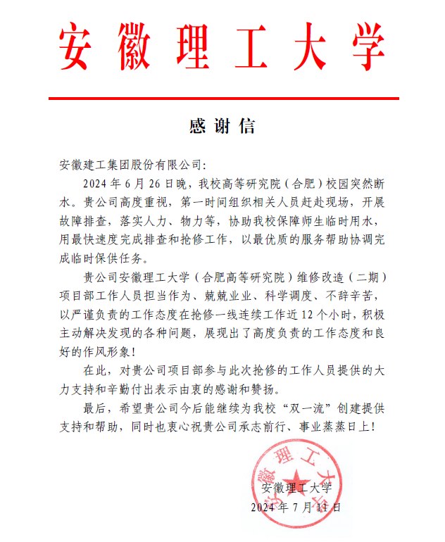 近日,安徽建科总承包分院收到安徽理工大学感谢信,对安徽理工大学(合肥高等研究院)维修改造(二期)项目部在校园夜间突发断水抢修过程中提供的大力支持和辛勤付出表示感谢。