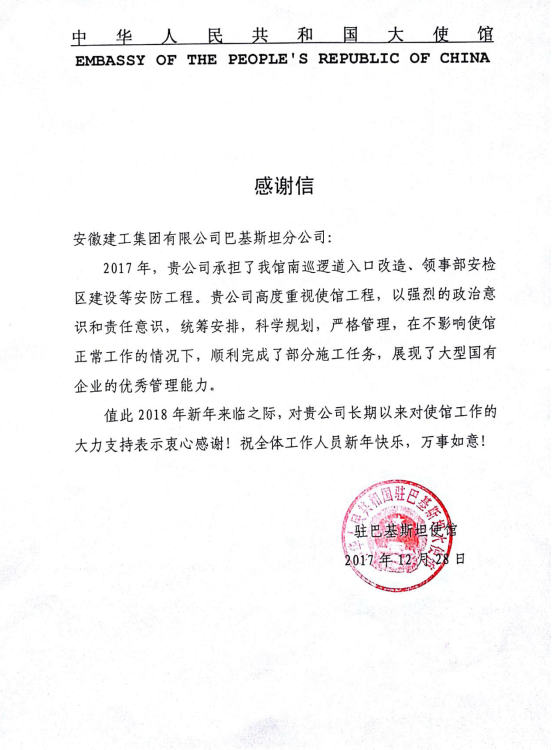 On the occasion of the coming New Year’s Day, 2018, Embassy of the People’s Republic of China in Pakistan sent a letter of thanks to ACEG Pakistan Branch highly commending the state-of-the-art technologies, the qualities and managements of the modification and construction works for the Embassy’s facilities and premises completed by ACEG Pakistani Branch and also expressing its new year’s blessings to all staff of ACEG Pakistani Branch.